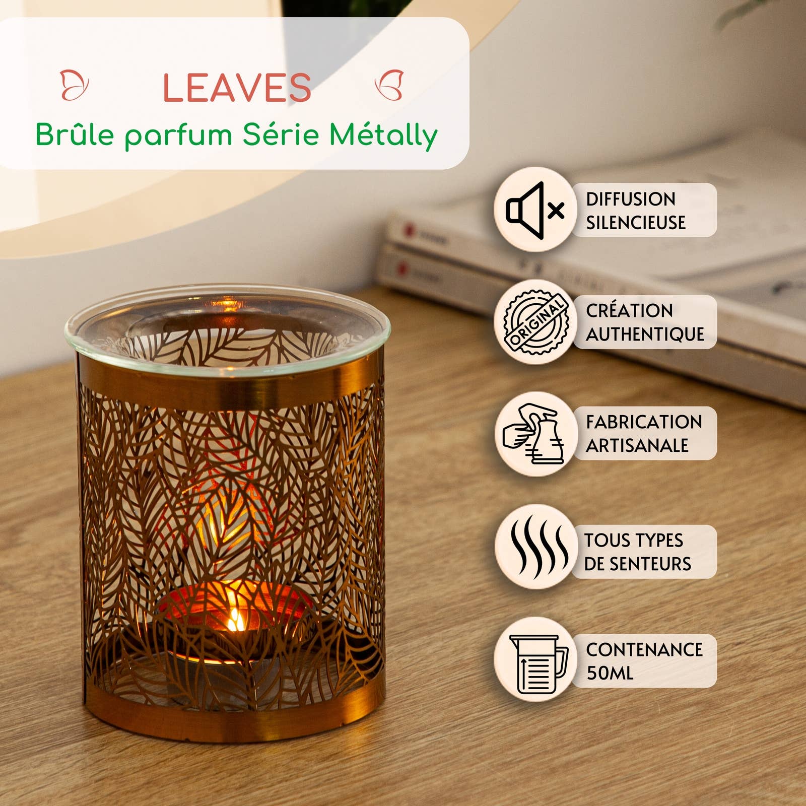 Leaves oljebrenner: Den tilhører vår Metally-kolleksjon, som inkluderer våre lysestaker laget av metall og glass, naturlige materialer.